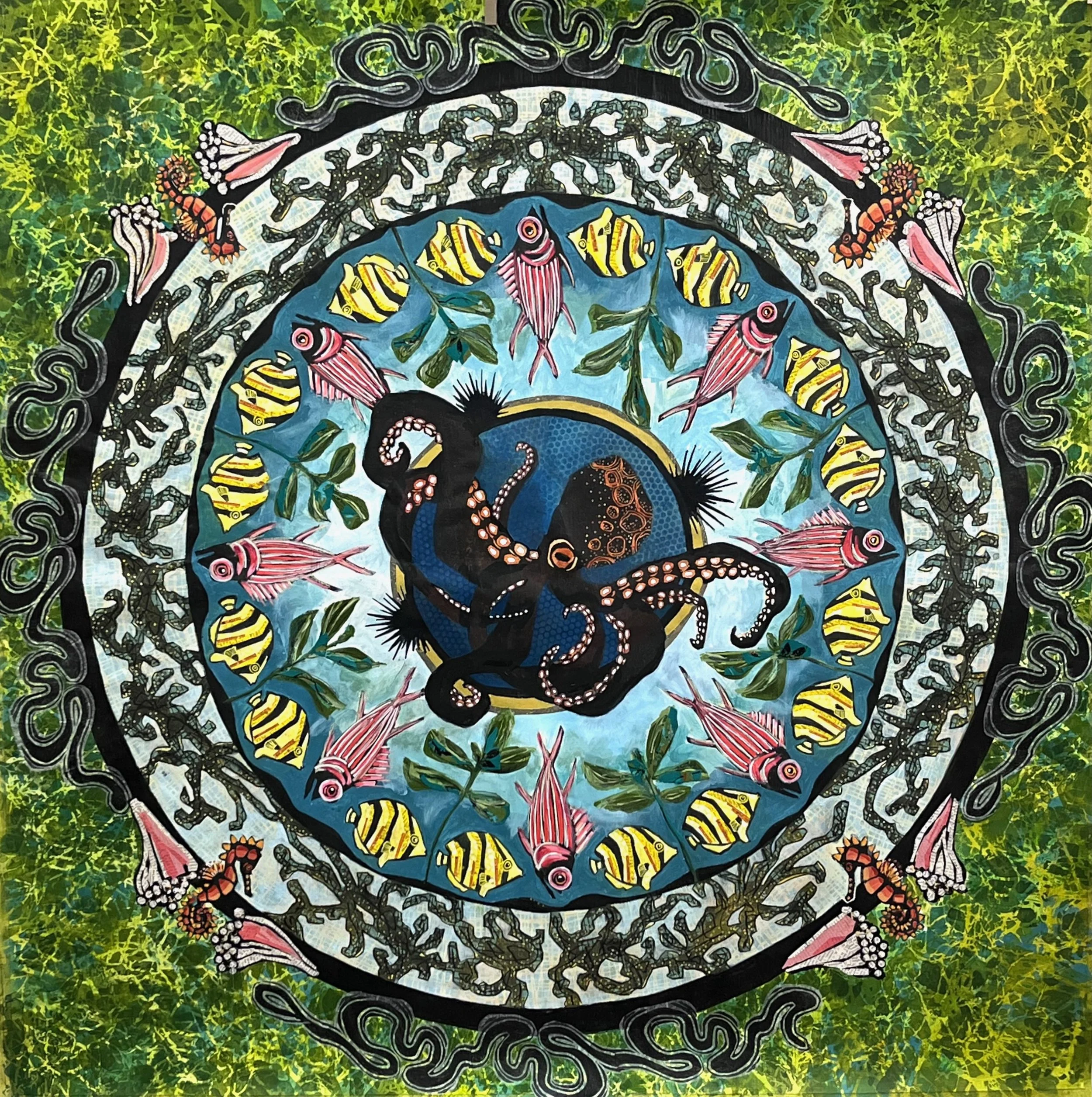 Caroline Coolidge Brown, Reef Dreaming, collaged and painted woodblock print, 40" x 40"