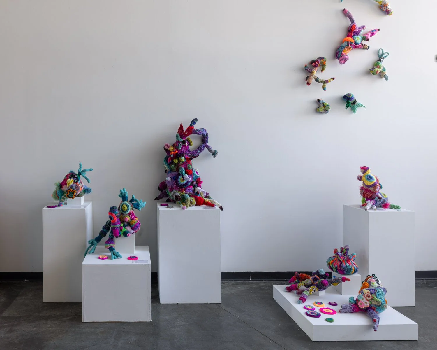 Her use of vintage lace, yarn, and scraps of familial clothing reference memory and the passage of time. The work forms through accumulated layering in strange and colorful ways. The soft biomorphic sculptures are a lively contrast to the industrial features of the museum’s lobby space. Organic forms are crocheted and stitched together – traditionally craft techniques associated with domesticity and “women’s work”. This woman’s work defies the centuries-old debate between what is art and what is craft. Instead, Udell’s work joyfully renders the question moot.